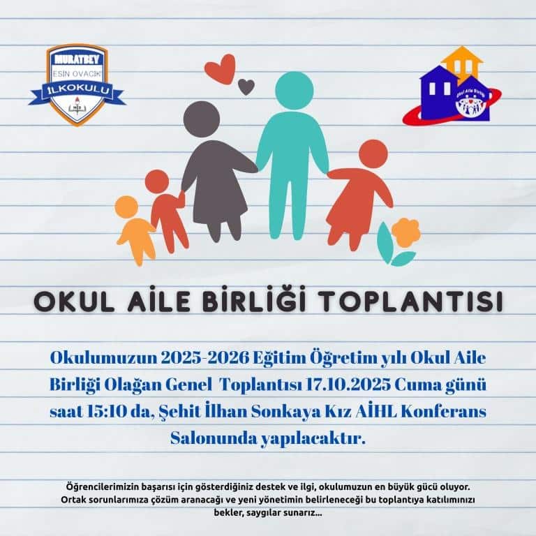 Okulumuzun 2025-2026 Eğitim Öğretim yılı Okul Aile Birliği Olağan GenelToplantısı 17.10.2025 Cuma günü saat 15:10 da, Şehit İlhan Sonkaya Kız AİHL Konferans Salonunda yapılacaktır. Toplantıya tüm velilerimiz davetlidir.